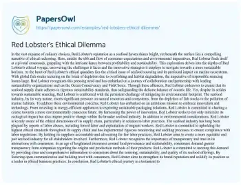 This essay about Red Lobster’s ethical challenges and its journey towards sustainability. It explores how the company balances profitability with responsible seafood sourcing, environmental concerns, and labor practices within its supply chain. Red Lobster’s commitment to partnerships with sustainability organizations, innovation in reducing its environmental footprint, and upholding ethical labor standards are highlighted. The essay emphasizes the importance of transparency and trust in communicating with consumers and concludes with Red Lobster’s role as a leader in promoting ethical business practices within the seafood industry.