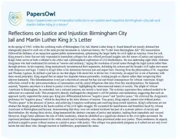 King's "Letter from Birmingham Jail" is not merely a historical document but a living text. It challenges us to reflect on our own positions and actions concerning justice and injustice. It urges us to recognize the interconnectedness of our struggles and commit to pursuing justice, even when it is uncomfortable or unpopular. King's reflections compel us to examine our own lives and societies, to seek out and confront injustice wherever it exists, and to strive tirelessly for a world where justice truly prevails.