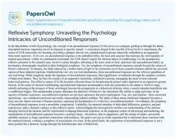 A journey into the intricacies of behavioral psychology with an essay exploring the concept of the unconditioned response (UCR). Delve into the foundational work of Ivan Pavlov and the inherent, unlearned reactions organisms exhibit in response to specific stimuli. From the reflexive salivation of Pavlov’s dogs to the broader spectrum of human emotional universals, the essay unravels the spontaneous choreography encoded in our biological symphony. Beyond the laboratory, discover how UCRs extend into advertising and the nuanced interplay of individual differences in shaping these innate responses. This essay invites readers to ponder the reflexive ballet that underlies complex behaviors, offering insights into the primal codes imprinted in our genetic and experiential tapestry. You can also find more related free essay samples at PapersOwl about Psychology.