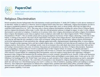 Belief's boundaries become battlegrounds where discrimination wounds sacred freedoms. P. Smith (2017) defines it as the adverse treatment of an individual, whether an employee or otherwise, based on religious beliefs rather than merit. Additionally, religious discrimination can refer to the unjust or prejudicial treatment of a group or individual due to their chosen faith, creed, or sincere beliefs, which may not align with an established faith system (Fox et al., 2015). This essay seeks to discuss religious discrimination, including the various forms of religious bigotry and how religious discrimination affects today’s world, while also offering potential solutions to mitigate its impact.