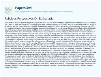 This essay will explore various religious viewpoints on euthanasia, discussing how different faiths interpret the moral and ethical implications of end-of-life decisions. It will cover perspectives from major world religions and how these beliefs influence the euthanasia debate. PapersOwl showcases more free essays that are examples of Assisted Suicide.