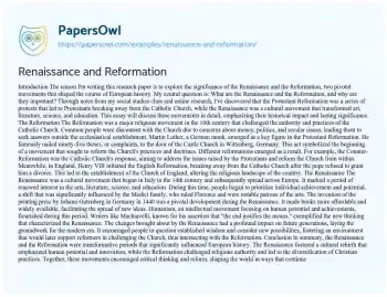 This essay will discuss the Renaissance and Reformation periods in history. It will cover their origins, key figures, cultural and religious impacts, and how these movements shaped the course of European history. PapersOwl offers a variety of free essay examples on the topic of Martin Luther.