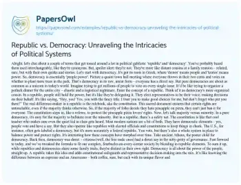Republic vs. Democracy: Unraveling the Intricacies of Political Systems. (2024, Feb 01). Retrieved from https://hub.papersowl.com/examples/republic-vs-democracy-unraveling-the-intricacies-of-political-systems/