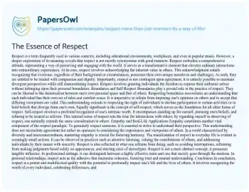 The Essence of Respect. (2024, Feb 01). Retrieved from https://hub.papersowl.com/examples/respect-more-than-just-manners-its-a-way-of-life/