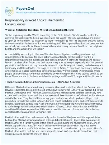 Accountability for the spoken word is a responsibility that often is overlooked and especially when it comes to religious and secular leaders. Leaders often forget that their words carry a lot of weight, especially with the general population and those that may be easily swayed to specific ways of thinking and who may act irrationally and take a leader's message as a "Call to Action." There have been many instances where religious leaders' words had dire consequences. We will explore two instances where people of prominence have made comments or written papers that have caused others to do harm. These are Martin Luther's anti-Semitic writings and Donald Trump's anti-Semitic words.