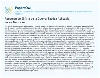 El arte de la guerra: ensayo de administración y el uso de la táctica de la guerra en los negocios. El arte de la guerra ensayo administracionEl Arte de la guerra es un libro que ha sido escrito hace más de mil años, sin embargo, a pesar de su antigüedad no ha sido olvidado, puesto que la filosofía que transmite es tan interesante que se sigue aplicando al día de hoy en distintas, así como utilizadas e implementadas por los más grandes empresarios de éxito, presidentes y en general, todas aquellas personas que han marcado una diferencia en sus respectivos campos.