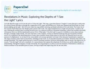 Embark on a lyrical journey through the enchanting realm of “I See the Light” in this insightful essay. Delving into the musical masterpiece from Disney’s “Tangled,” the narrative unravels the profound emotions and transformative moments encapsulated in the lyrics. Explore the metaphorical brilliance of light as a symbol for love and self-discovery, skillfully crafted by lyricists Glenn Slater and Alan Menken. Beyond a mere soundtrack, the essay reveals how the song’s simplicity belies its universal resonance, leaving an indelible mark on listeners. Join the exploration of this musical gem, understanding how “I See the Light” transcends the screen to become a timeless testament to the emotional power of music. PapersOwl offers a variety of free essay examples on the topic of Music Industry.