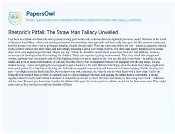 This essay demystifies the straw man fallacy, a deceptive tactic in argumentation where an opponent’s position is intentionally misrepresented and then easily discredited. It describes the fallacy as a two-step process: first, distorting the original argument into a weaker, oversimplified version, and then attacking this distorted version instead of engaging with the actual issue. The essay underscores how prevalent this fallacy is in various domains, from politics to everyday conversations, and how it serves as a dishonest shortcut to ‘win’ debates without genuinely addressing the real points. It highlights the detrimental effects of this fallacy on meaningful discourse, emphasizing that it leads to misunderstanding and conflict rather than constructive dialogue. The piece concludes by encouraging readers to recognize and counter this fallacy, stressing the importance of sticking to the facts and maintaining integrity in discussions. Overall, the essay presents the straw man fallacy as a major pitfall in rhetoric, one that needs to be identified and avoided to ensure honest and effective communication. PapersOwl offers a variety of free essay examples on the topic of Rhetoric.