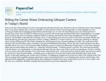 This essay offers a lively and insightful look into the evolving concept of lifespan careers. It paints a picture of the modern career path as a dynamic journey, marked by changes, pivots, and continuous learning, rather than a linear progression to retirement. The piece emphasizes the importance of flexibility in career planning, encouraging readers to adapt their professional lives to fit personal growth and life changes. It highlights the necessity of lifelong learning in staying relevant and competitive in today’s fast-paced job market. The essay also acknowledges the challenges of navigating lifespan careers, including the need for self-awareness and the risks associated with career transitions. However, it ultimately portrays lifespan careers as an exciting opportunity for personal and professional fulfillment, urging readers to embrace adaptability, continuous learning, and a redefinition of career success. This approachable and engaging piece provides valuable insights for anyone navigating the complexities of modern career development. PapersOwl showcases more free essays that are examples of Career