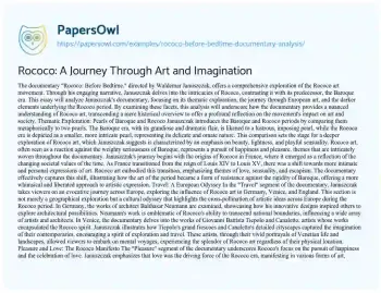 The documentary "Rococo: Before Bedtime," directed by Waldemar Januszczak, offers a comprehensive exploration of the Rococo art movement. Through his engaging narrative, Januszczak delves into the intricacies of Rococo, contrasting it with its predecessor, the Baroque era. This essay will analyze Januszczak's documentary, focusing on its thematic exploration, the journey through European art, and the darker elements underlying the Rococo period. By examining these facets, this analysis will underscore how the documentary provides a nuanced understanding of Rococo art, transcending a mere historical overview to offer a profound reflection on the movement's impact on art and society.