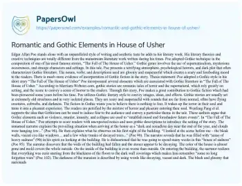 This essay will analyze the blend of Romantic and Gothic elements in Edgar Allan Poe’s “The Fall of the House of Usher,” discussing how these aspects contribute to the story’s eerie atmosphere and underlying themes. At PapersOwl too, you can discover numerous free essay illustrations related to Edgar Allan Poe.