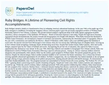 Ruby Bridges: A Lifetime of Pioneering Civil Rights Accomplishments. (2024, May 12). Retrieved from https://hub.papersowl.com/examples/ruby-bridges-a-lifetime-of-pioneering-civil-rights-accomplishments/
