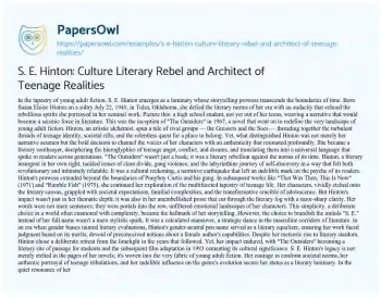 S. E. Hinton: Culture Literary Rebel and Architect of Teenage Realities. (2024, Feb 01). Retrieved from https://hub.papersowl.com/examples/s-e-hinton-culture-literary-rebel-and-architect-of-teenage-realities/