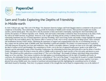 This essay delves into the intricate and profound friendship between Samwise Gamgee and Frodo Baggins in J.R.R. Tolkien’s “The Lord of the Rings.” It explores how their relationship evolves from a simple gardener and master dynamic into a deep, complex bond forged in the fires of their perilous journey to Mount Doom. The essay highlights Sam’s unwavering loyalty and courage, contrasting it with Frodo’s struggles under the Ring’s influence, to illustrate the significance of support and companionship in overcoming adversity. It also examines the theme of sacrifice, showing how Sam and Frodo’s mutual willingness to put the other’s welfare above their own underscores a key message of the saga: the extraordinary impact of ordinary individuals driven by love and duty. This exploration of Sam and Frodo’s friendship not only underscores its importance in Tolkien’s narrative but also serves as a powerful testament to the strength and resilience found in true companionship. The essay encapsulates how their journey together is emblematic of the triumph of friendship and loyalty in the face of overwhelming darkness. PapersOwl showcases more free essays that are examples of Friendship.