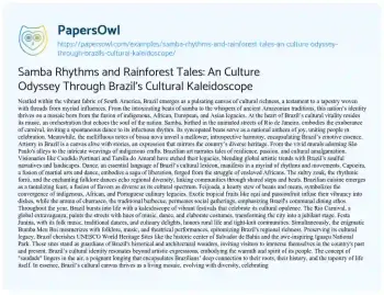 Samba Rhythms and Rainforest Tales: An Culture Odyssey Through Brazil's Cultural Kaleidoscope. (2023, Dec 01). Retrieved from https://hub.papersowl.com/examples/samba-rhythms-and-rainforest-tales-an-culture-odyssey-through-brazils-cultural-kaleidoscope/