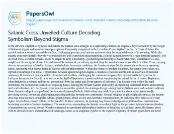 An exploration of the Satanic cross in an essay that goes beyond surface perceptions, unraveling its enigmatic layers and historical significance. Delve into the origins of this symbol, tracing its roots to early Christianity and its evolution into various forms within modern Satanism, such as the Sigil of Baphomet. Examine the diverse interpretations and meanings attributed to the Satanic cross, from defiance against religious dogma to a symbol of intellectual rebellion and personal autonomy. Navigate through the controversies and societal perceptions surrounding this emblem, shedding light on its role in popular culture and its impact on the ongoing discourse between freedom of expression and societal norms. Ultimately, the essay invites readers to reconsider preconceptions and approach the Satanic cross as a complex symbol within the rich tapestry of human beliefs and symbolism. PapersOwl offers a variety of free essay examples on the topic of Culture.