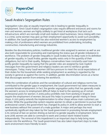 Saudi Arabia’s Segregation Rules. (2021, Feb 24). Retrieved from https://hub.papersowl.com/examples/saudi-arabias-segregation-rules/