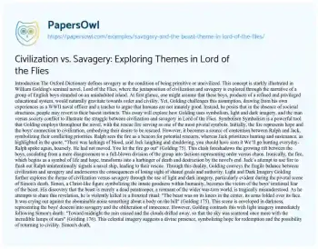 Civilization vs. Savagery: Exploring Themes in Lord of the Flies. (2020, Apr 22). Retrieved from https://hub.papersowl.com/examples/savagery-and-the-beast-theme-in-lord-of-the-flies/