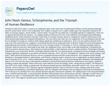 John Nash: Genius, Schizophrenia, and the Triumph of Human Resilience. (2019, Jul 14). Retrieved from https://hub.papersowl.com/examples/schizophrenia-the-beautiful-mind-of-john-forbes-nash-jr/