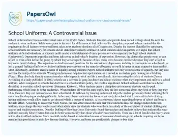 This essay will discuss the controversial issue of school uniforms. It will examine arguments for and against their use, including impacts on student behavior, freedom of expression, and school safety. PapersOwl showcases more free essays that are examples of Issue.