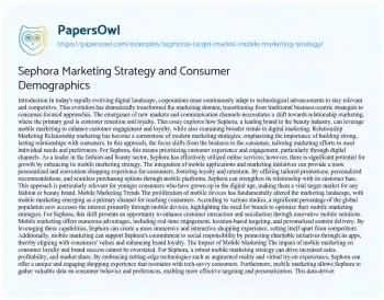 Sephora, a leading beauty retailer, has developed a sophisticated mobile marketing strategy to engage its target market effectively. This essay analyzes Sephora’s approach to targeting and reaching its core demographic through mobile platforms. It explores the company’s use of mobile apps, social media, and digital marketing techniques to enhance customer engagement and personalize the shopping experience. The overview also examines how Sephora’s mobile strategy aligns with its broader marketing goals and the evolving preferences of its customer base. The piece aims to highlight the successes and challenges of Sephora’s mobile marketing initiatives, offering insights into the future of retail marketing in the beauty industry. You can also find more related free essay samples at PapersOwl about Advertising.