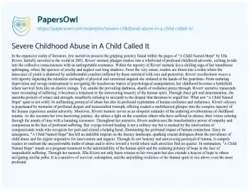 This essay about “A Child Named Hope” by Ella Rivers explores the profound impact of childhood adversity and resilience. Through vivid recollections, Rivers paints a chilling picture of abuse, yet amidst despair, she illuminates the enduring power of the human spirit to triumph over trauma. The memoir serves as a poignant reminder of the far-reaching effects of abuse and the importance of empathy in healing. It sparks crucial discussions about child abuse and underscores the imperative for intervention and support. “A Child Named Hope” stands as a testament to resilience, offering a beacon of hope amidst darkness.