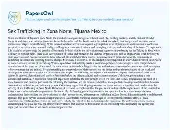 In essence, Zona Norte is a mosaic of contradictions, a living canvas that challenges preconceptions. Understanding its definition requires an embrace of complexity, allowing us to appreciate the rich tapestry that makes Tijuana’s Zona Norte a unique and evolving cultural phenomenon. On PapersOwl, there’s also a selection of free essay templates associated with Sex Trafficking.