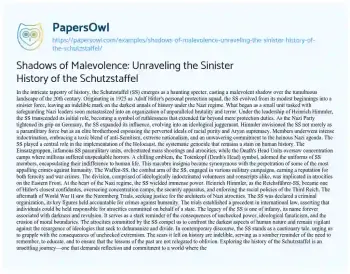 An essay on the Schutzstaffel (SS) delves into the chilling history of this infamous paramilitary organization under Nazi Germany. From its origins as a protection squad for Hitler to its evolution into an ideological force, the essay explores the SS’s role in heinous acts, including the Holocaust and war crimes. The text reflects on the SS’s indoctrination, symbols like the Totenkopf, and its influence in enforcing the Third Reich’s racial policies. It underscores the legacy of the SS as a symbol of brutality, urging readers to confront the darkest facets of history and remain vigilant against ideologies that threaten the essence of humanity. The essay serves as a sobering exploration of a malevolent force that left an indelible mark on the 20th century. At PapersOwl too, you can discover numerous free essay illustrations related to History.