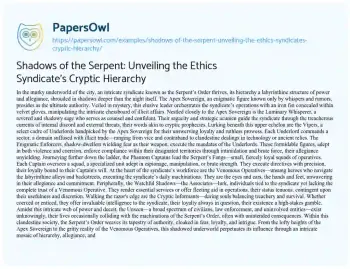 Shadows of the Serpent: Unveiling the Ethics Syndicate's Cryptic Hierarchy. (2023, Dec 01). Retrieved from https://hub.papersowl.com/examples/shadows-of-the-serpent-unveiling-the-ethics-syndicates-cryptic-hierarchy/