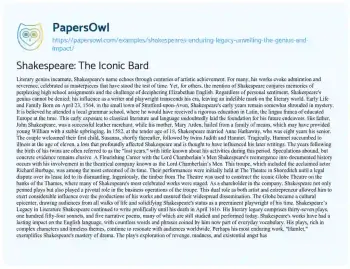 Shakespeare: The Iconic Bard. (2023, Aug 16). Retrieved from https://hub.papersowl.com/examples/shakespeares-enduring-legacy-unveiling-the-genius-and-impact/