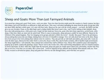 This essay playfully explores the distinct differences between sheep and goats, two commonly confused farm animals. Starting with their physical appearances, the essay points out the key features like sheep’s woolly coats and goats’ sleeker hair, along with differences in their tails and horns. It then dives into their personalities, highlighting sheep as the followers of the animal kingdom, preferring to stay in groups, while portraying goats as the curious adventurers, always ready to explore. The essay also examines the different roles these animals play in human agriculture and culture. Sheep are celebrated for their wool and meat, symbolizing peace and tranquility in art and literature. Goats, known for their dairy products, are adaptable to harsh environments and often symbolize independence and vitality in cultural narratives. This engaging piece not only clarifies the physical and behavioral distinctions between sheep and goats but also illuminates their unique contributions to human life and culture, showcasing their individual quirks and characteristics in a fun and informative way. More free essay examples are accessible at PapersOwl about Animals.