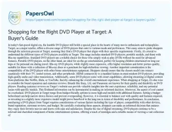 This essay serves as a comprehensive guide for Target shoppers looking to purchase a DVD player. It categorizes the various types of DVD players available, including standard, portable, and Blu-ray models, each catering to different viewing needs. The essay emphasizes the importance of compatibility with existing home entertainment systems, highlighting the necessity of features like HDMI connectivity and smart capabilities for streaming digital content. It also advises on considering brand reputation and customer reviews, suggesting well-known brands like Sony, LG, and Panasonic for their quality and durability. Additionally, the essay stresses the importance of balancing cost with quality, encouraging shoppers to set a budget while being mindful of long-term benefits. Overall, the piece provides a detailed overview of selecting a DVD player at Target, ensuring an informed and satisfactory purchase. Despite the surge in digital streaming, the essay underscores the continued relevance of DVD players in home entertainment, offering a reliable and nostalgic way to enjoy a wide range of media. Also at PapersOwl you can find more free essay examples related to Shopping.