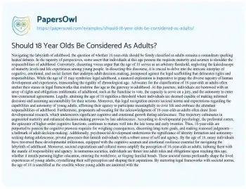 This essay about the classification of 18-year-olds as adults explores the complexities of adulthood, juxtaposing legal frameworks with developmental psychology and societal expectations. It into arguments for and against this classification, highlighting the nuances of individual maturity and the challenges faced by young adults in contemporary society. Advocating for a more nuanced approach, it emphasizes the importance of considering individual competencies and support systems in navigating the transition to adulthood successfully. Ultimately, it argues that the to adulthood transcends mere chronological age, encompassing a diverse tapestry of experiences and aspirations.
