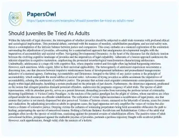 This essay about the adjudication of juveniles navigates the intricate ethical and sociological implications of trying them as adults. It explores the tension between cognitive development and legal culpability, advocates for accountability and deterrence, prioritizes victim rights, and discusses the delicate balance between recidivism and rehabilitation. By intertwining developmental insights with imperatives of societal welfare, it proposes a nuanced approach to juvenile justice that transcends binary discourse, fostering a holistic milieu centered on justice and compassion.