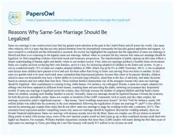 This essay will discuss the debate surrounding the legalization of same-sex marriage. It will examine the arguments for and against legalization, covering legal, moral, and social perspectives. The piece will explore the implications of same-sex marriage for equality and human rights, considering the impact of legalization in countries where it has occurred and the ongoing challenges in areas where it remains contentious. More free essay examples are accessible at PapersOwl about Gender.