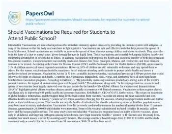 This essay will discuss the debate surrounding mandatory vaccinations for students attending public schools. It will examine the arguments for and against compulsory vaccination, including public health benefits, herd immunity, and individual rights. The piece will also explore legal and ethical considerations, including religious and personal belief exemptions. It will reference recent outbreaks of vaccine-preventable diseases, the role of government in public health, and the impact of vaccination policies on community health. The essay aims to present a balanced view of this contentious issue, considering the implications for students, families, and the wider community. PapersOwl offers a variety of free essay examples on the topic of Disease.