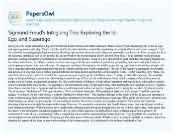 This essay delves into the fascinating psychological framework of Sigmund Freud, focusing on his trio of concepts: the id, ego, and superego. It presents an engaging exploration of these three critical elements of the human psyche, explaining how they interact to shape our personality and behavior. The id is portrayed as the instinctual, pleasure-seeking component, the ego as the rational mediator balancing desires with reality, and the superego as the moral judge upholding societal and ethical standards. Through everyday examples, the essay illustrates the dynamic interplay between these parts, providing insight into our decision-making processes and internal conflicts. It offers a reader-friendly introduction to Freud’s influential ideas, while also acknowledging the theory’s criticisms and its place in the broader context of psychological thought. This piece is a compelling narrative that brings to light the complexities of our inner mental world, guided by Freud’s enduring concepts. More free essay examples are accessible at PapersOwl about Sigmund Freud.