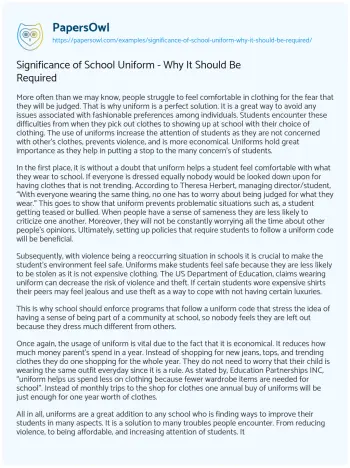 Significance of School Uniform - Why It Should Be Required. (2021, Apr 26). Retrieved from https://hub.papersowl.com/examples/significance-of-school-uniform-why-it-should-be-required/