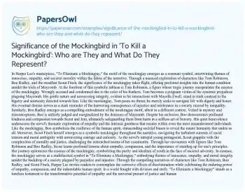Significance of the Mockingbird in 'To Kill a Mockingbird': Who are They and What Do They Represent?. (2024, May 01). Retrieved from https://hub.papersowl.com/examples/significance-of-the-mockingbird-in-to-kill-a-mockingbird-who-are-they-and-what-do-they-represent/