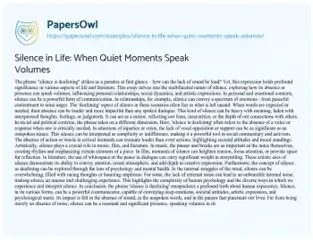 This essay explores the profound impact and multifaceted nature of silence in various aspects of life. It examines how silence, often perceived as a lack of sound, can communicate a wide spectrum of emotions and meanings in personal relationships, where its presence can range from comforting to unsettling. The essay also delves into silence’s role in social and political contexts, highlighting how its absence in crucial moments can signify complicity or indifference, thus becoming a powerful tool in social commentary. Additionally, the piece touches on the artistic significance of silence in music, film, and literature, where it is used to convey emotion, create atmosphere, and add depth. Finally, the essay considers silence from a psychological perspective, discussing how it can lead to an overwhelming internal noise for some, emphasizing the complexity of human psychology. Overall, the essay presents silence as a resonant and significant aspect of life, capable of conveying deep emotions and societal attitudes, far beyond just being an absence of noise. PapersOwl offers a variety of free essay examples on the topic of Life.