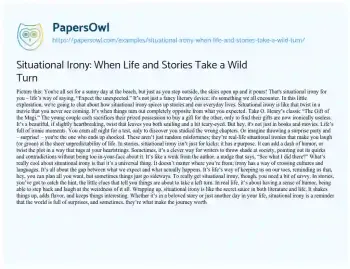 This essay dives into the intriguing world of situational irony, a phenomenon where reality playfully defies expectations, both in literature and everyday life. It begins by painting a vivid picture of situational irony, showing it as life’s way of adding unexpected twists to our neatly laid plans. The essay uses classic examples like O. Henry’s “The Gift of the Magi” to illustrate how situational irony creates memorable, often poignant moments in storytelling. It also brings this concept into the real world, highlighting humorous and ironic scenarios we might encounter daily, like studying the wrong chapters for a test. The piece underscores situational irony’s role in adding depth and humor to narratives, as well as its function as a subtle societal commentary by authors. Emphasizing its universal appeal, the essay shows that understanding situational irony requires a blend of insight and humor, whether in interpreting stories or navigating the surprises of everyday life. Conclusively, situational irony is presented as a vital element that enriches our experiences, reminding us of the unpredictability and joy of both stories and life. Also at PapersOwl you can find more free essay examples related to Irony.