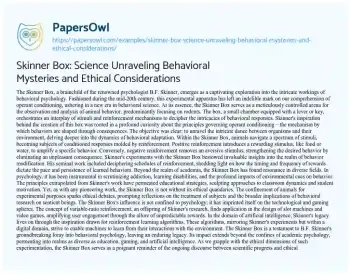An essay on the Skinner Box offers an exploration into the realm of behavioral psychology, delving into the creation and impact of B.F. Skinner’s innovative experimental apparatus. It unfolds the intricacies of operant conditioning, elucidating how organisms, primarily rodents, learn and adapt their behavior in response to stimuli and reinforcement within this controlled environment. The essay may dissect Skinner’s pioneering research on positive and negative reinforcement, schedules of reinforcement, and the ethical considerations surrounding the use of the Skinner Box. Additionally, it can discuss the broader implications of Skinner’s work, ranging from its influence on educational practices to its applications in technology, gaming, and artificial intelligence. The Skinner Box becomes a lens through which to examine the complex interplay of behavior, environment, and ethical responsibility in the pursuit of scientific understanding. PapersOwl showcases more free essays that are examples of Science.