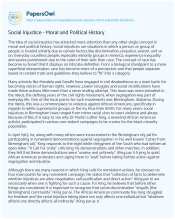Social Injustice - Moral and Political History. (2021, Mar 20). Retrieved from https://hub.papersowl.com/examples/social-injustice-moral-and-political-history/