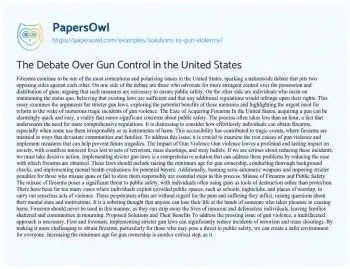 This essay will explore potential solutions to gun violence. It will discuss a range of approaches, including legislative measures, community-based programs, mental health initiatives, and public awareness campaigns. The piece will consider the effectiveness of different strategies in various contexts, as well as the political and social challenges in implementing these solutions. Also at PapersOwl you can find more free essay examples related to Gun.