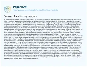 This essay about James Baldwin’s “Sonny’s Blues” explores the intricate dynamics between two brothers, Sonny and the narrator, against the backdrop of 1950s Harlem. It into themes of familial ties, personal struggle, and the transformative power of art. Through Baldwin’s adept use of symbolism and imagery, the narrative portrays Sonny’s of redemption through music, juxtaposed with the narrator’s internal conflict. Ultimately, the story serves as a testament to the resilience of the human spirit and the capacity for empathy and understanding in the face of adversity.