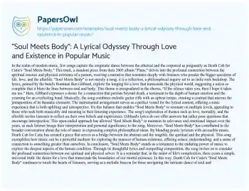 "Soul Meets Body": A Lyrical Odyssey Through Love and Existence in Popular Music. (2024, Feb 20). Retrieved from https://hub.papersowl.com/examples/soul-meets-body-a-lyrical-odyssey-through-love-and-existence-in-popular-music/