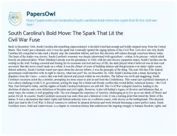 South Carolina's Bold Move: The Spark That Lit the Civil War Fuse. (2024, Mar 25). Retrieved from https://hub.papersowl.com/examples/south-carolinas-bold-move-the-spark-that-lit-the-civil-war-fuse/