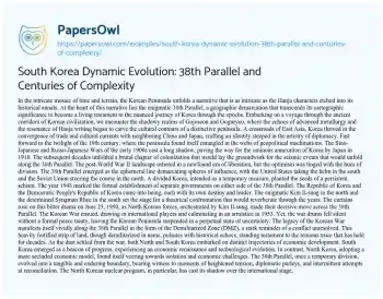 South Korea Dynamic Evolution: 38th Parallel and Centuries of Complexity. (2024, Mar 01). Retrieved from https://hub.papersowl.com/examples/south-korea-dynamic-evolution-38th-parallel-and-centuries-of-complexity/