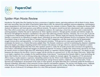 By employing a critical lens, this essay seeks to understand the enduring popularity of Spider-Man and its implications for future superhero narratives. Through specific examples and scholarly insights, the discussion will highlight the franchise's contributions to the genre while addressing potential criticisms. Ultimately, this review aims to provide a comprehensive understanding of Spider-Man's role in shaping modern cinema.