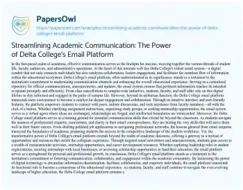 This essay about the significance of Delta College’s email platform in enhancing communication within the academic community. It highlights how the platform serves as a centralized hub for official communications, fosters collaboration among students and faculty, and cultivates essential communication skills crucial for success in both academia and the professional world. Additionally, the summary emphasizes how the email platform provides access to a wealth of resources and opportunities, enriching the collegiate experience beyond the confines of the classroom.